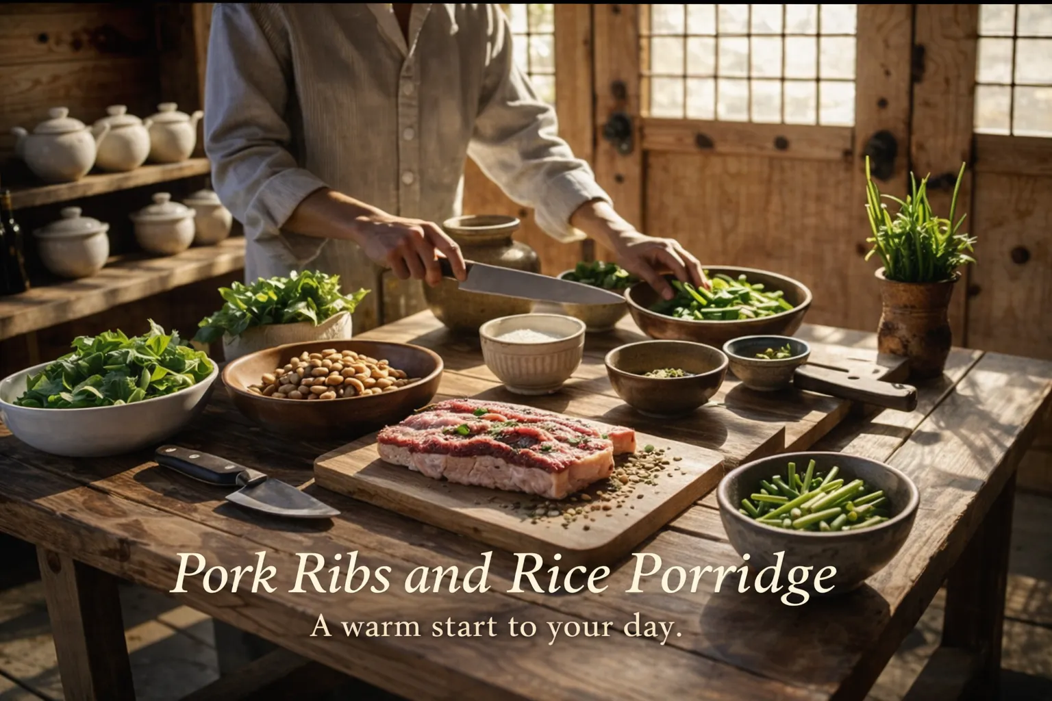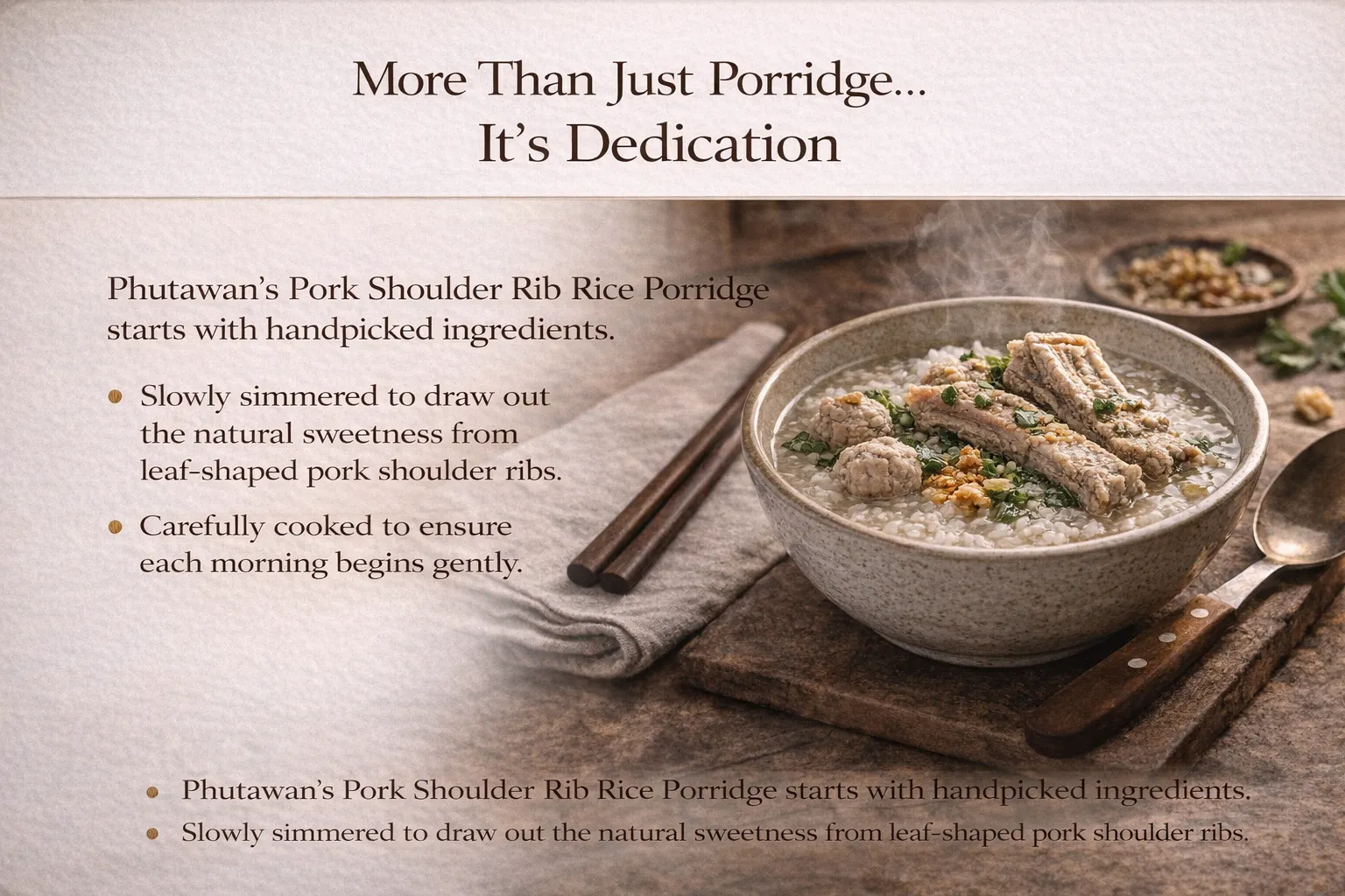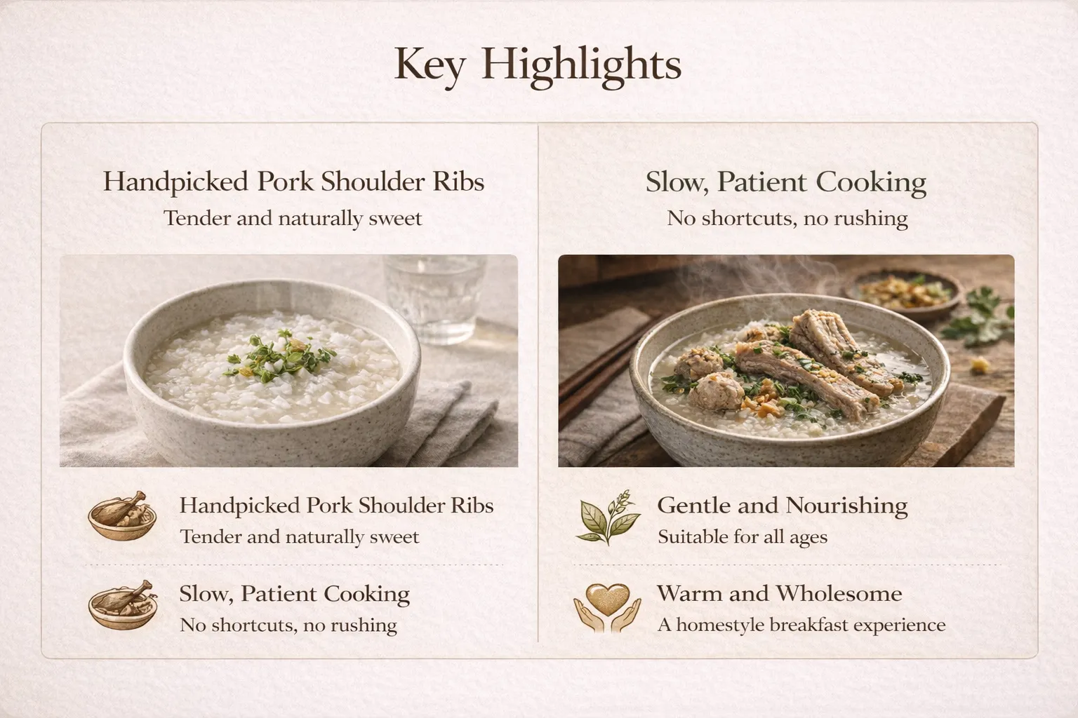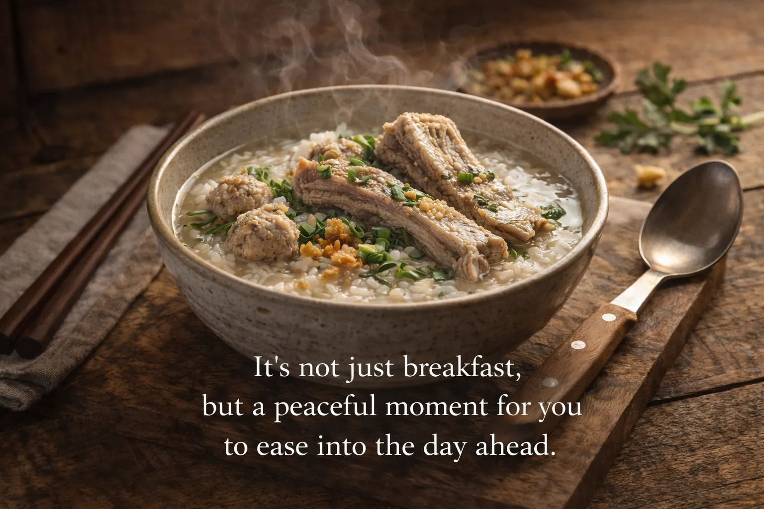 Breakfast: Rice porridge with pork ribs and herbs.