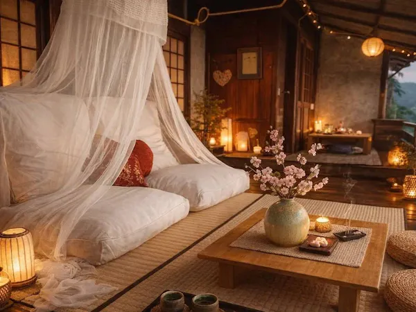 Tea Corner: จัดวางโต๊ะไม้เตี้ยและแจกันดอกไม้สไตล์ lkebana พร้อมพรมขนเฟอร์สีเทาอ่อนมอบสัมผัสที่พรีเมี่ยมและนุ่มนวลภายใต้แสงธรรมชาติ