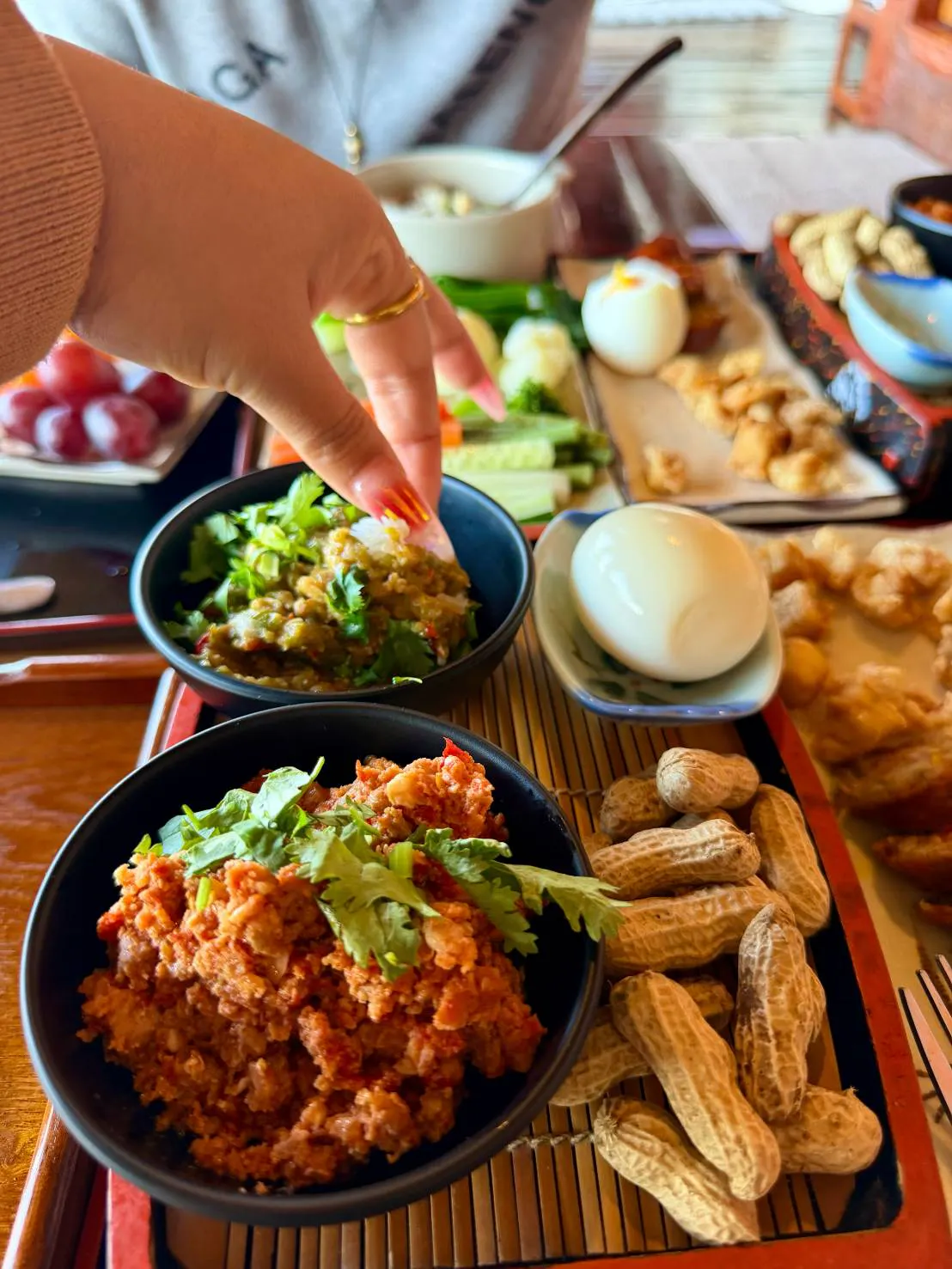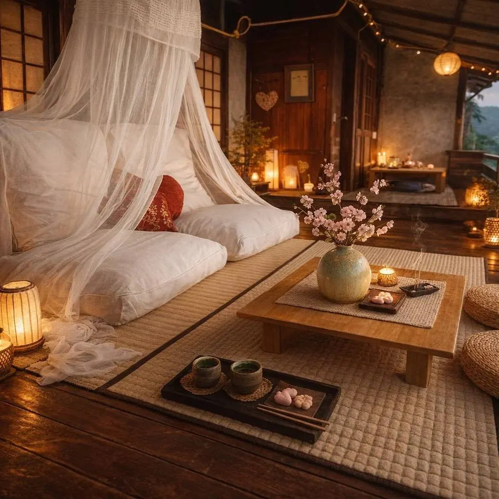 Tea Corner: จัดวางโต๊ะไม้เตี้ยและแจกันดอกไม้สไตล์ lkebana พร้อมพรมขนเฟอร์สีเทาอ่อนมอบสัมผัสที่พรีเมี่ยมและนุ่มนวลภายใต้แสงธรรมชาติ